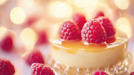 caramel custard pudding with raspberries on a blurred bokeh background. Ideal for dessert advertisements with copy text space.