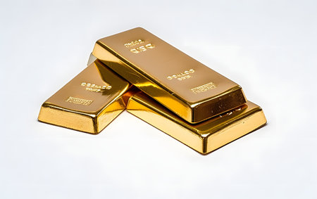 Gold bars neatly placed on a white backdrop, illustrating rising gold prices and the growing cost of precious metals. Simple design with copy space.