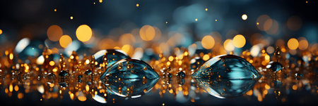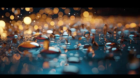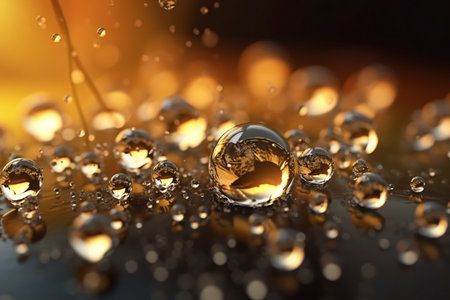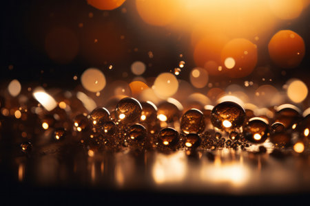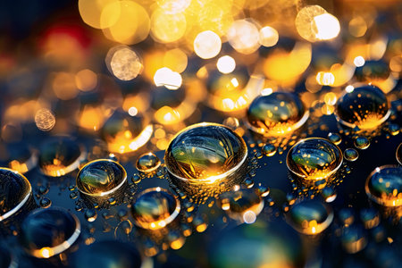 This close-up image captures water droplets on a surface, showcasing their reflections against a beautiful bokeh light background. The warm glow adds elegance and depth.