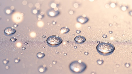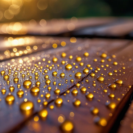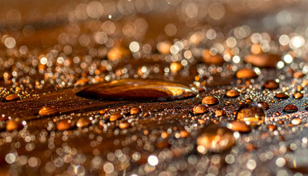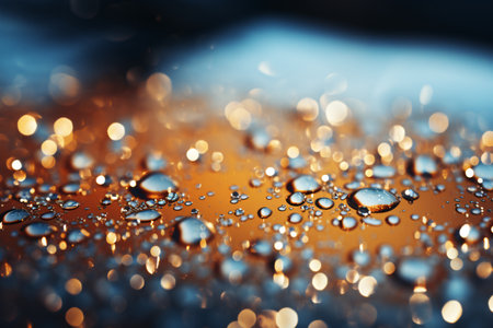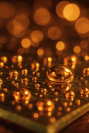 A captivating close-up photograph featuring water droplets resting on a glossy surface, enhanced by shimmering bokeh lights that create a warm and inviting atmosphere.