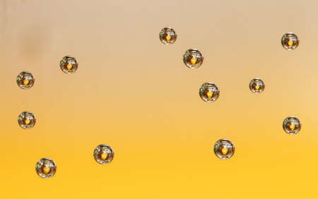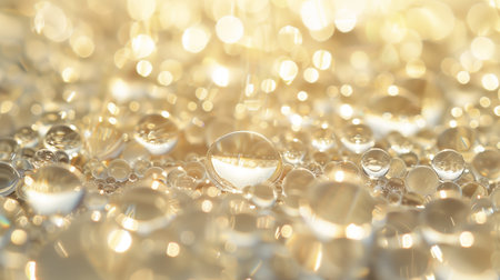 This is a closeup view of transparent bubbles that reflect light beautifully, set against a shimmering golden backdrop