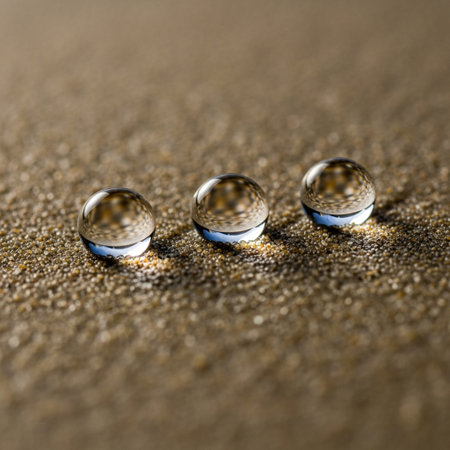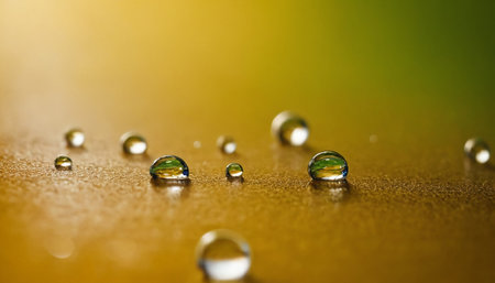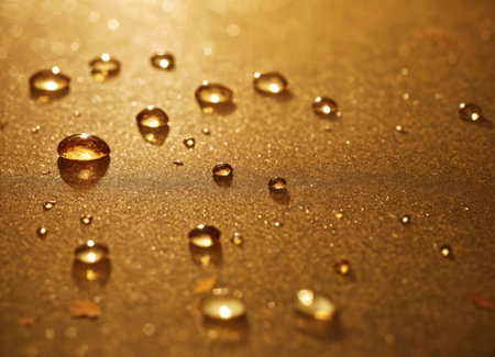 A mesmerizing close-up of shimmering water droplets scattered across a smooth, golden reflective surface, bathed in warm natural light. The droplets catch the light, creating a sparkling effect that highlights their delicate shapes and the rich golden tones of the background. The subtle texture of the surface adds depth, evoking a sense of purity and tranquility. Perfect for themes of nature, water elements, golden hour beauty, and serene minimalism, this image is ideal for wellness projects, abstract designs, or environmental campaigns.