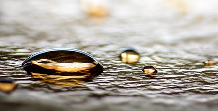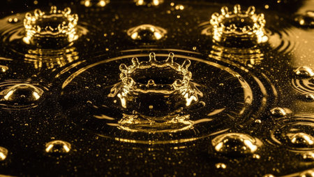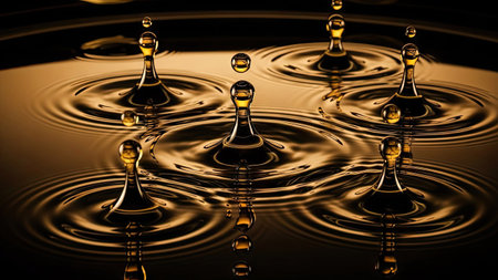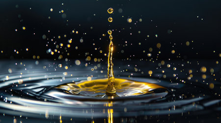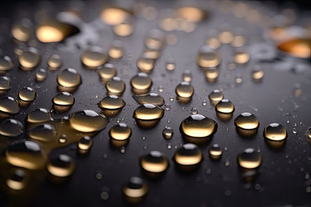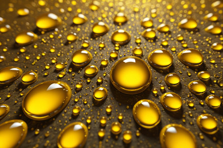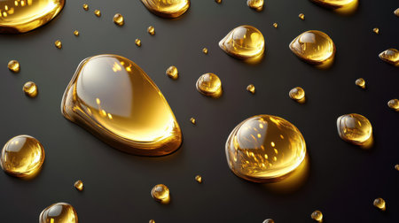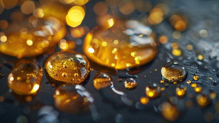 Captivating image of glimmering golden oil droplets against a dark surface, perfect for artistic and creative projects that need a touch of elegance and beauty.