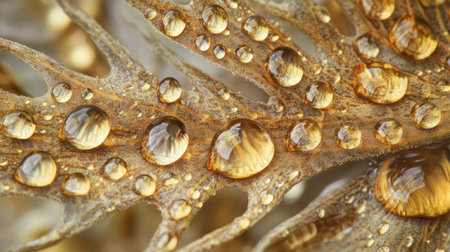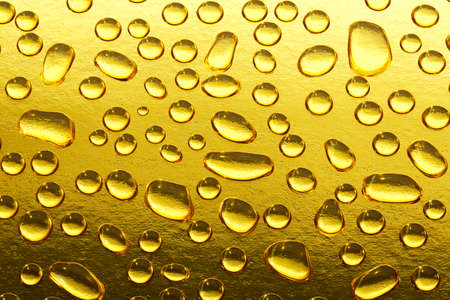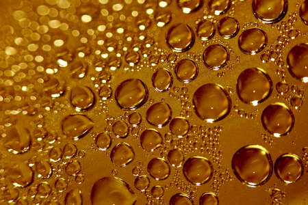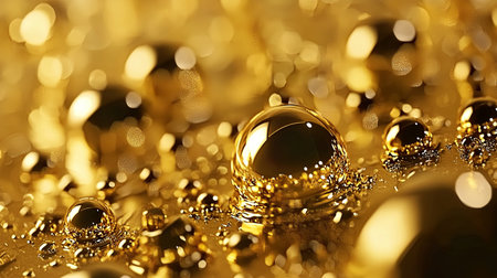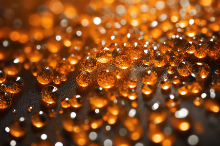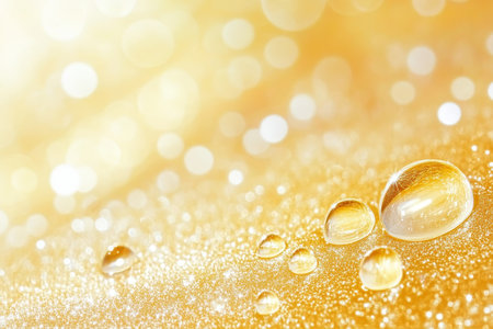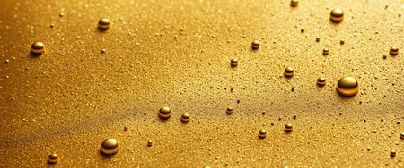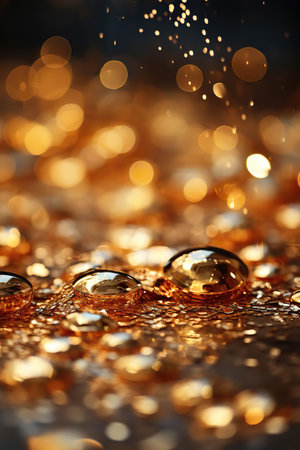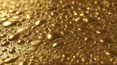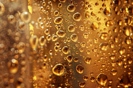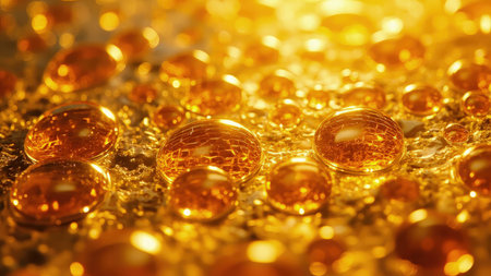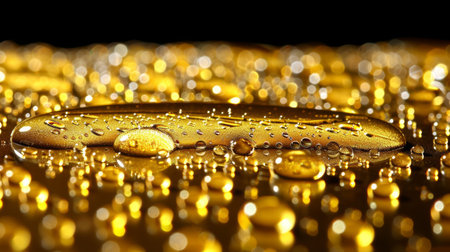 Delicate golden liquid drops are captured in stunning macro photography, creating mesmerizing abstract textures. The close-up detail reveals the water's intricate patterns, enhanced by light reflections and bubbles. This elegant, shiny display of liquid gold evokes feelings of luxury and wealth. Perfect for use as a beautiful background in art and design projects, this image is ideal for conveying a sense of preciousness and sophistication. The transparent surface and amber hues offer a unique visual appeal.