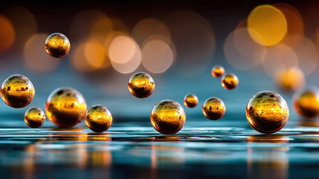 , digitally rendered scene featuring numerous shiny, golden, spherical objects suspended just above or resting on a slick, dark blue reflective surface. The background is intentionally blurred with soft, out-of-focus circular lights in warm orange and yellow tones, creating a strong contrast with the cool foreground.