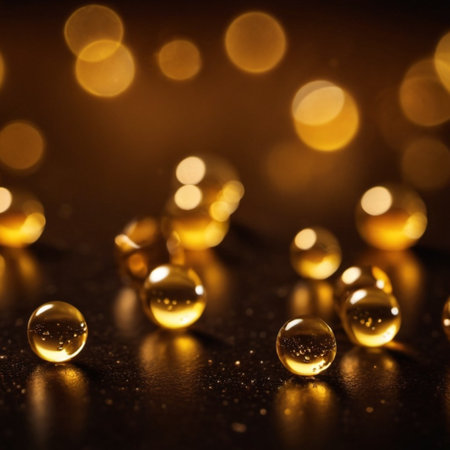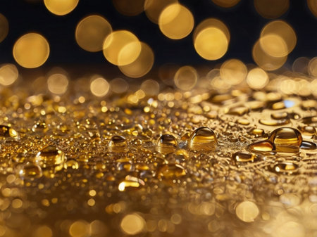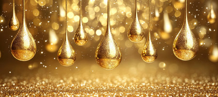 Glittering golden oil droplets are spread on a dark surface, reflecting soft light and creating an enchanting atmosphere with a touch of elegance.