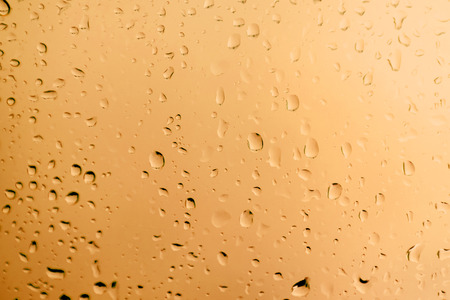 water droplets on a surface reflecting out-of-focus lights, creating a bokeh effect. The droplets appear clear and round, reflecting the warm, yellow light of the blurred lights in the background.