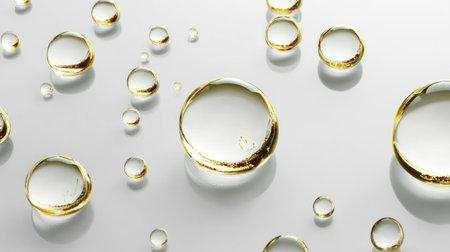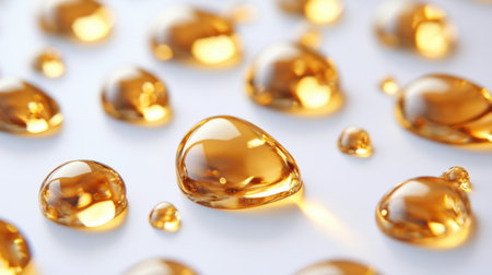 A collection of golden oil drops displayed on a smooth white surface, perfect for use in beauty, wellness, or abstract design projects.