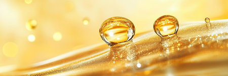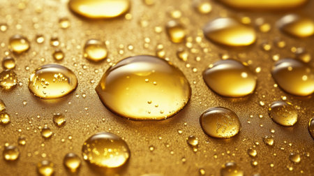 This close-up image showcases glimmering golden oil droplets on a smooth surface, creating an elegant and soothing aesthetic. Perfect for beauty and culinary projects.