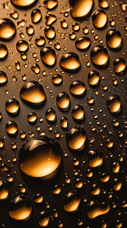 A stunning close-up of golden water droplets on a smooth metallic surface, showcasing the beauty of light reflections and textures. Perfect for creativity.