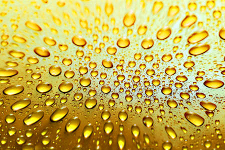 Close-up of golden liquid drops on a smooth yellow surface, creating an elegant and vibrant abstract background that radiates beauty and shine.