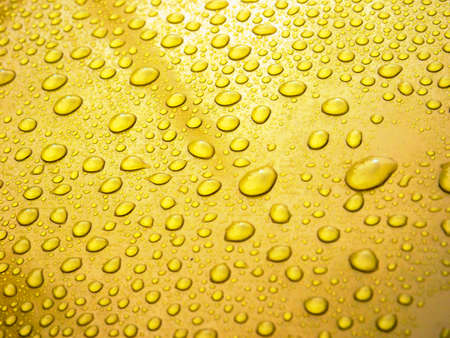Water drops on the yellow hood of a car. The clean and well waxed hood belongs to a blue and yellow taxi, that is registered in Chiang Mai, northern Thailand.