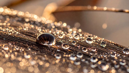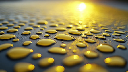 Golden Hour Reflection Water Droplets on a Metallic Surface, Capturing the Hydrophobic Effect