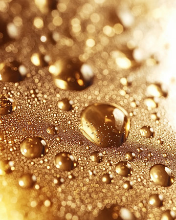 This stunning image features glimmering water drops on a shimmering golden surface, capturing the interplay of light and color in a mesmerizing way.