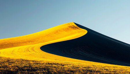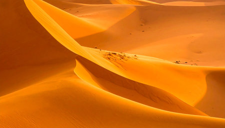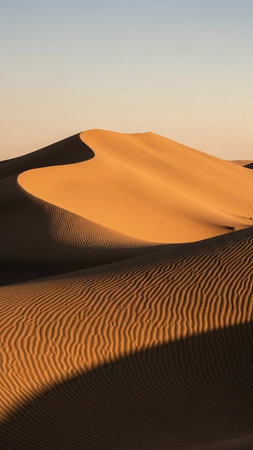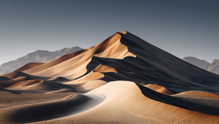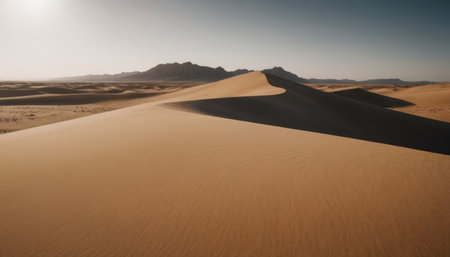 Stunning sand dunes form a captivating landscape, with soft curves and shadows under bright sunlight, evoking a sense of peace and connection to nature