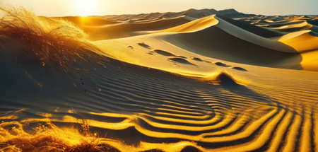 A breathtaking view of sand dunes illuminated by golden light during sunset creates a serene atmosphere in the vast desert landscape, ideal for nature lovers.