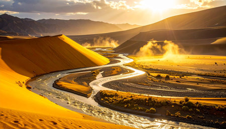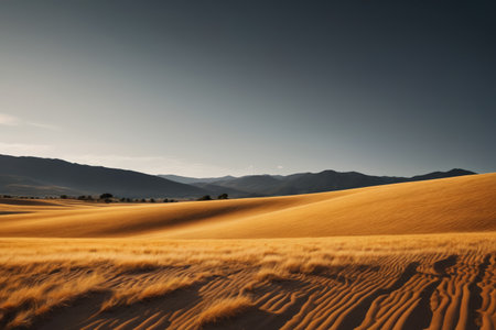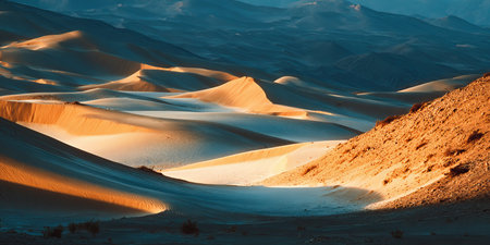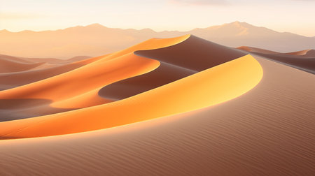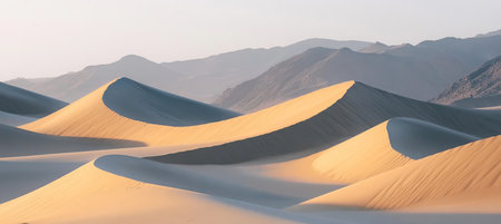 Majestic Golden Desert Landscape with Rolling Sand Dunes and Mountains Bathed in Morning Sunlight