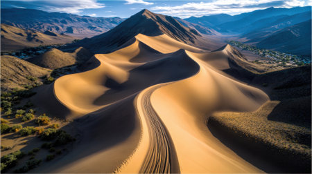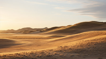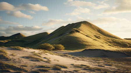 a stunning desert landscape in denmark, showcasing majestic hills bathed in perfect lighting. this captivating photograph, skillfully captured by a professional photographer, highlights the natural beauty and serene ambiance of the danish desert. ai generated