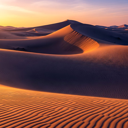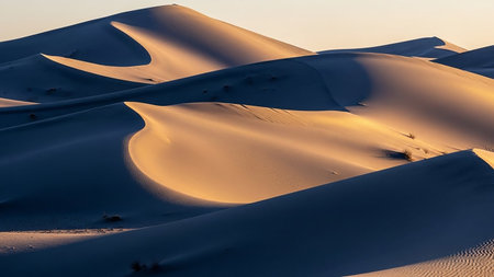 Beneath the warm light of golden hour, soft sand dunes create gentle ripples and shadows in an expansive desert landscape, conveying tranquility and beauty.