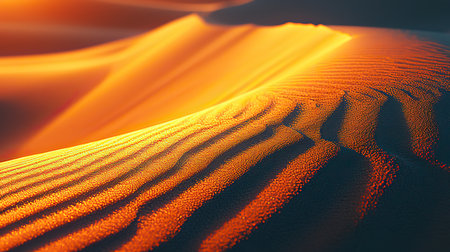 Detailed close-up of golden sand dunes showcasing parallel ripples and the interplay of light and shadow.