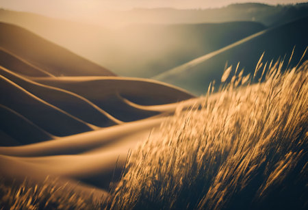 An AI generated illustration of Golden sunlight illuminates rolling sand dunes with a foreground of blurred grasses