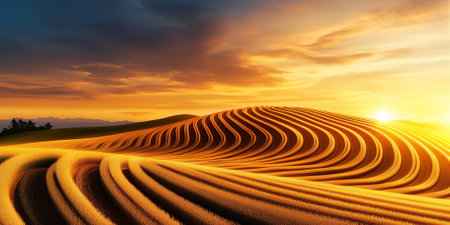 Endless rows of golden grains flow gracefully over rolling hills, illuminated by the warm glow of the setting sun.
