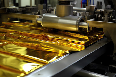 detail of foil packaging in production line, created with generative ai