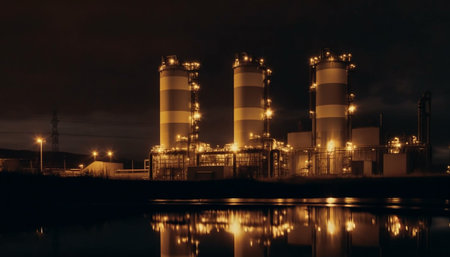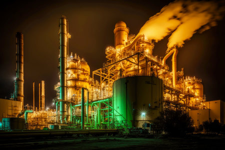 night illumination of plant for production of chemical products in industry, generative ai