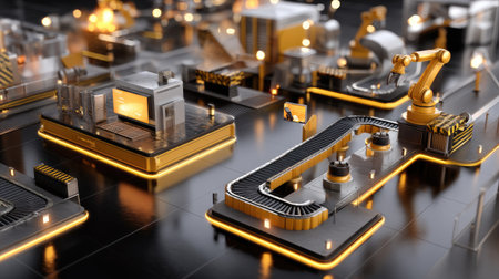 A highly detailed 3D rendering showcases a futuristic industrial setting featuring robotic arms, conveyor belts, and advanced machinery, emphasizing efficiency.