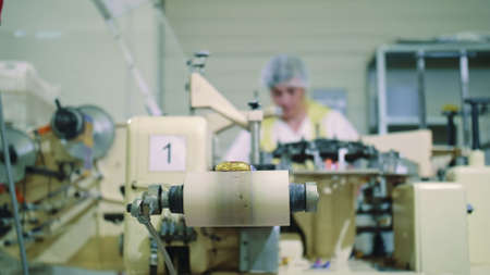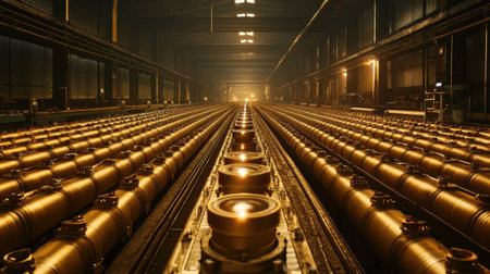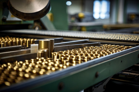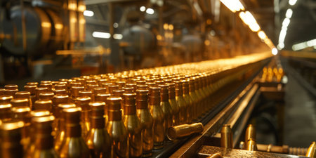 well-organized production line with automated machinery and workers carefully overseeing the production process. Bullets or shells move along the conveyor, undergoing various stages of manufacturing, including casing, filling, and packaging.