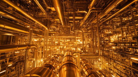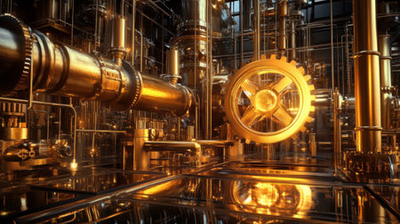 Discover a captivating scene of intricate machinery featuring golden gears and pipes in a beautifully lit industrial environment. Perfect for technology themes.