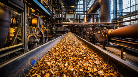 Vibrant industrial scene showcasing a conveyor belt transporting wood chips within a complex manufacturing facility featuring intricate pipes and machinery.
