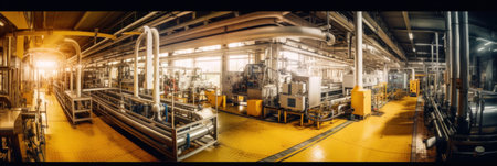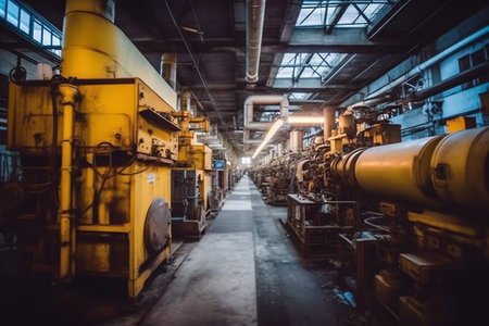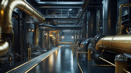 Industrial factory interior with machinery and pipes showcasing modern engineering concept
