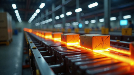Realistic illustration of cardboard boxes on conveyor belt. Al generated