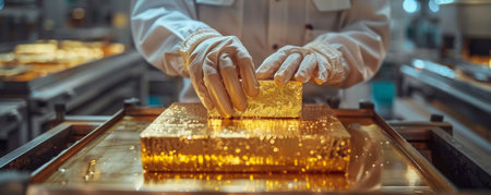 A captivating scene of industrial automation showcasing the processing of gold coins, showcasing machinery in action as shiny coins rain onto a sleek metal surface.