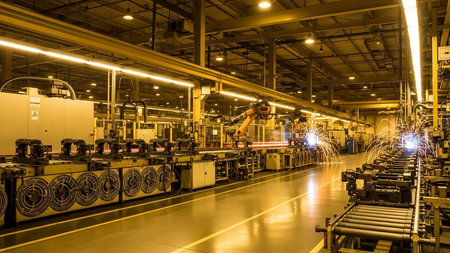 The interior of a brightly lit industrial factory featuring robotic arms, conveyor belts, and sparks from welding operations, with extensive ductwork overhead.