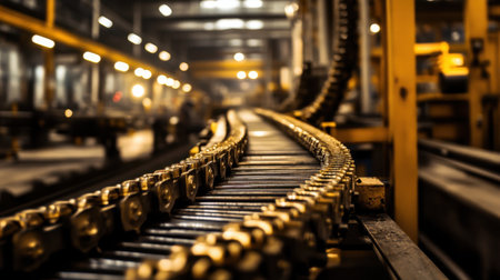 A close-up view of an industrial conveyor belt with chains inside a busy manufacturing facility. The image showcases machinery and logistics operations in action.