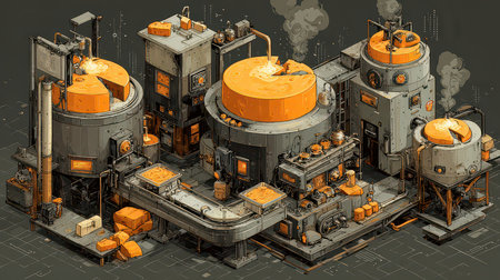 A detailed illustration of an industrial complex featuring large orange tanks and interconnected pipes, set against a dark background, showcasing modern machinery and processing systems.