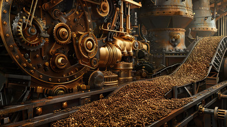 A detailed close-up of a steampunk-style machine processing wood pellets. The intricate gears and cogs, combined with the rustic metal textures, create a captivating industrial aesthetic.
