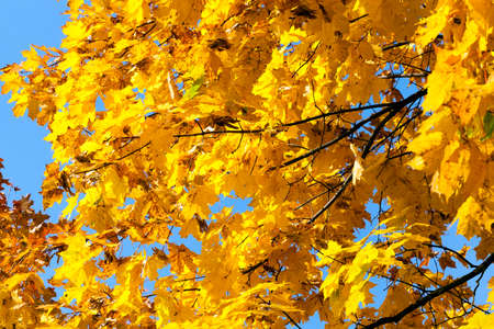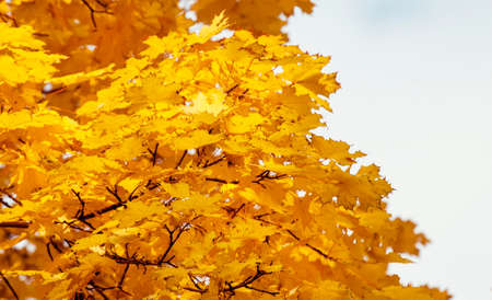 branches of a light yellow foliage maple in an autumn park in nature, detail during sunny weather