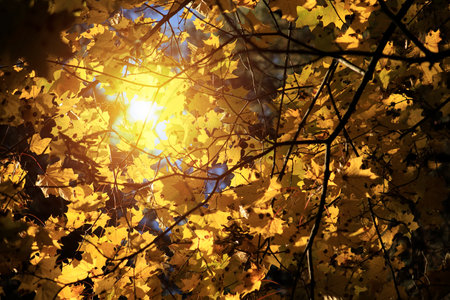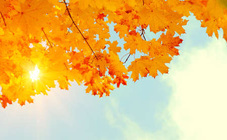 Yellow maple leaves falling from tree in autumn at blue sky with sun