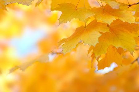 Defocused yellow maple leaves, blurred autumn background.
