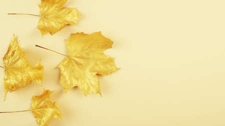 Golden maple leaves on a solid background for greeting cards and design, insert text, trend and autumn concept.