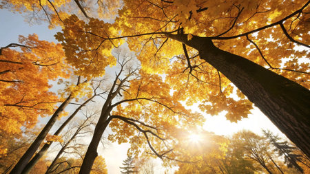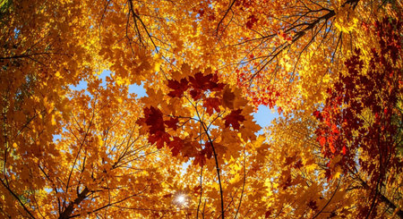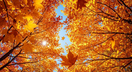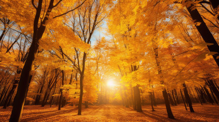 Vibrant autumn leaves creating a golden canopy in a serene forest setting during the fall season