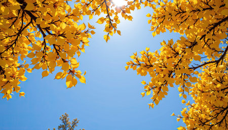 Experience a stunning view of vibrant yellow leaves framed by branches against a clear blue sky, capturing the essence of autumn's beauty and warmth.