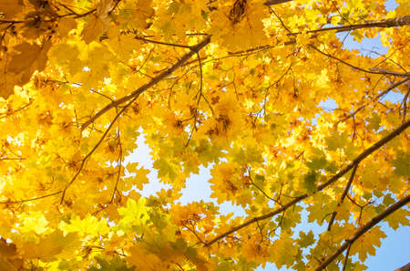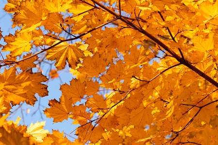 Yellow-orange maple leaves in the crown of a tree, view from below. Autumn maple leaves.