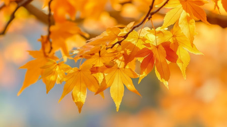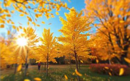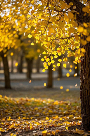 Vibrant golden leaves flutter in the breeze during a sunny autumn afternoon at the park