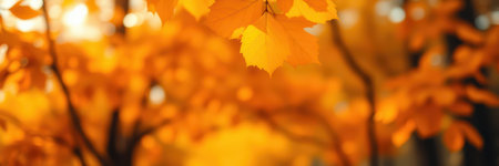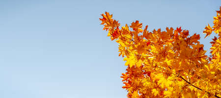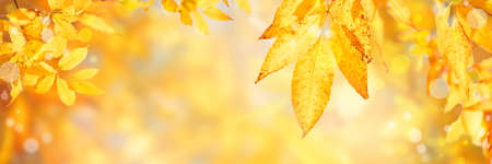 Fall banner. Beautiful autumn yellow and red foliage in golden sun. Falling leaves natural background landscape. copy space, selective focus. Full frame