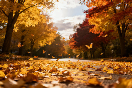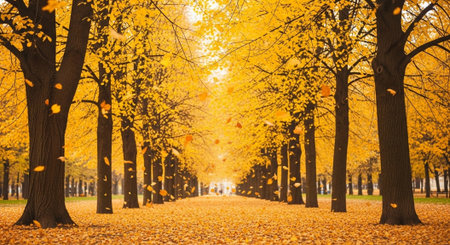 Falling autumn leaves in a park on a sunny afternoon. Warm, orange tones prevail. The serene image captures the beauty of the season.