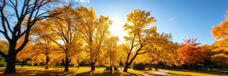 Vibrant autumn foliage illuminates a serene park under a clear blue sky in the afternoon sunlight